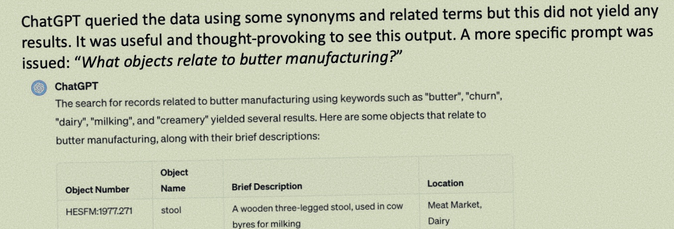 AI can also help with collections documentation. Museum data is often uneven, inconsistent, or difficult to search using conventional interfaces. With careful prompting and checking, AI can help clean exported datasets, identify gaps, and retrieve potentially relevant records through natural-language questions. It can also help staff and researchers explore collections in a more intuitive way, especially where terminology is inconsistent or specialist.