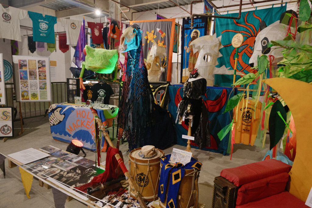 At the centre of the exhibition, I created a large-scale display of objects from the last 30 years of Golowan. This brought together banners, costumes and festival artefacts, making the recent history of the festival tangible and immediate.