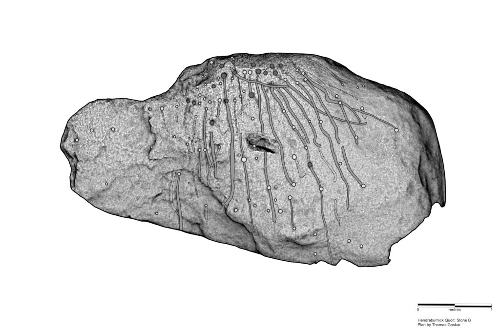 The analysis identified 105 cup-marks and 47 possible grooved lines radiating and connecting across the stone’s surface. The deeper cups are concentrated along the upper edge; shallower ones spread more widely, and the lines appear to flow downslope — suggesting they were carved after the stone was already in position rather than before it was moved. Multiple phases of carving are visible, with some marks clearly superimposed on others, pointing to a process of repeated inscription over centuries rather than a single planned design.